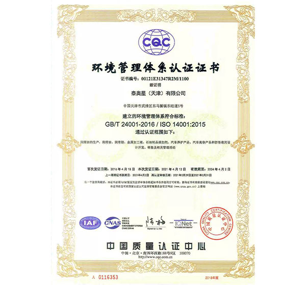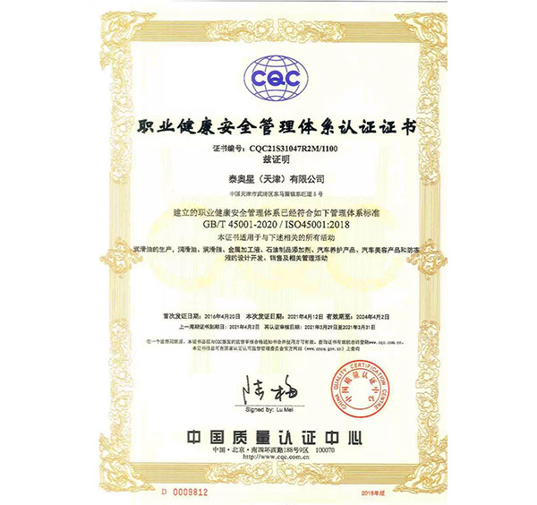 多年來,泰奧星堅持質量至上的經營理念,先后通過了ISO9001質量管理體系、ISO14001環境管理體系和、OHSAS18001職業健康安全管理體系及IATF16949質量管理體系四大體系認證。嚴格的質量控制體系保障了公司產品質量穩定優良,近年來,泰奧星先后被認定為CMMC中國潤滑材料行業十強、全國潤滑十佳企業、中國綠色低碳先鋒企業等。