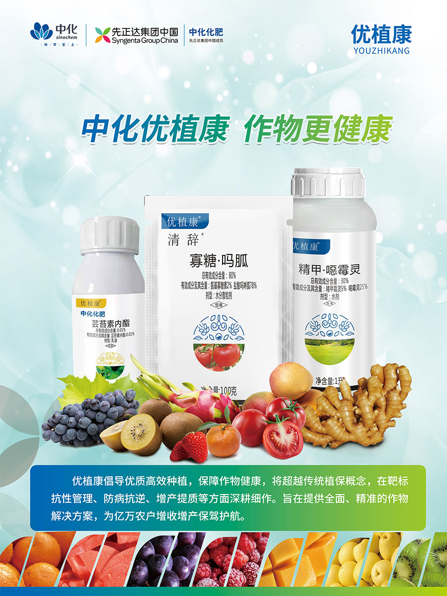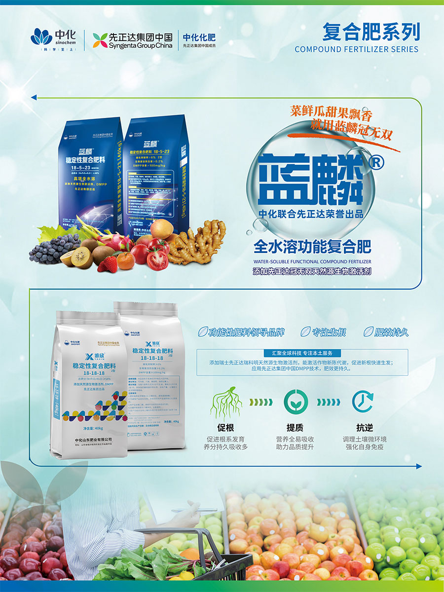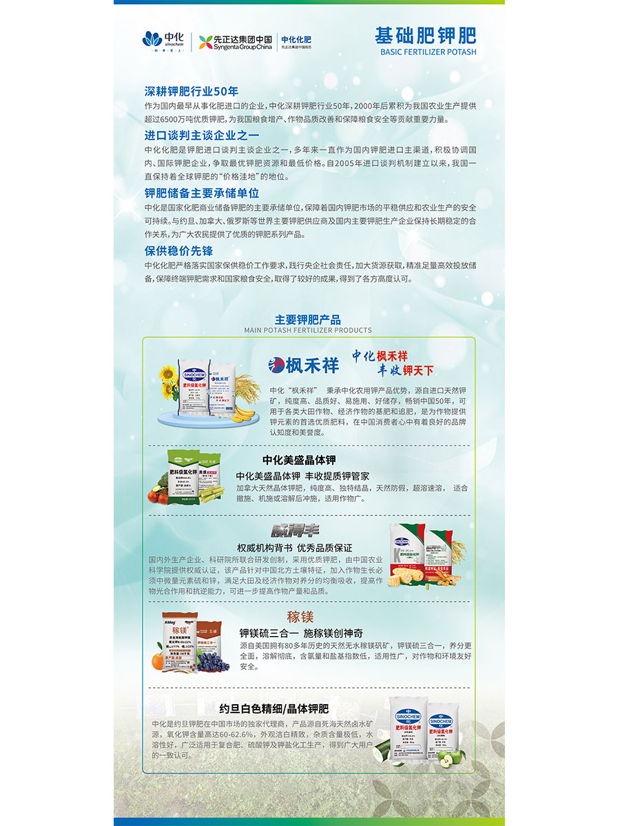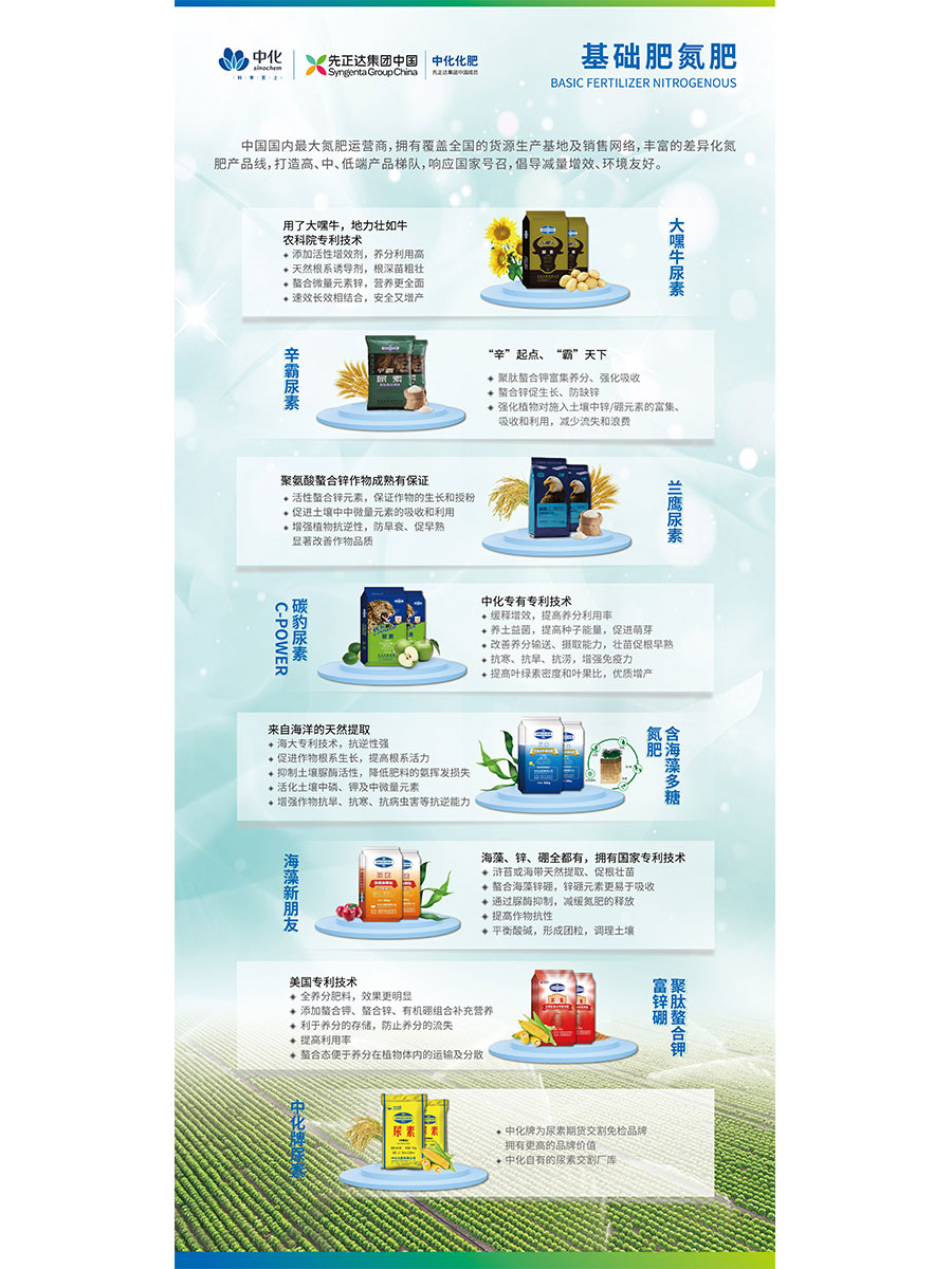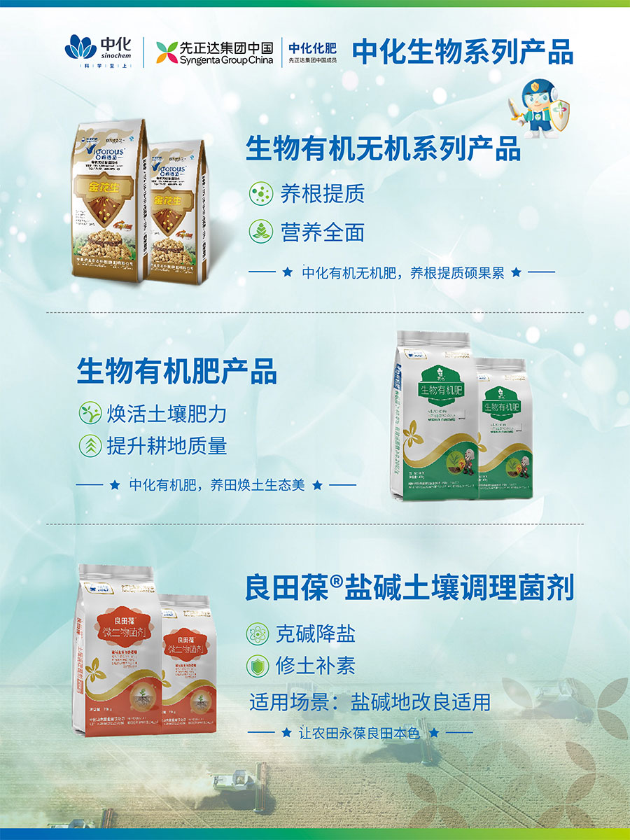 主要產品:差異化基礎肥(楓禾祥、中化美盛晶體鉀、美麟美、麟葆、中化二銨、三環中化二銨、碳豹);復合肥(藍麟、雅欣、菌越系列、維格施系列、科得豐、中化系列);特肥(優翠露、優靚美、養田、吉樂施);植保(中化優植康)等