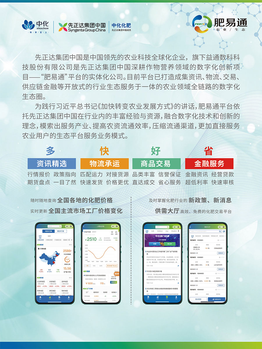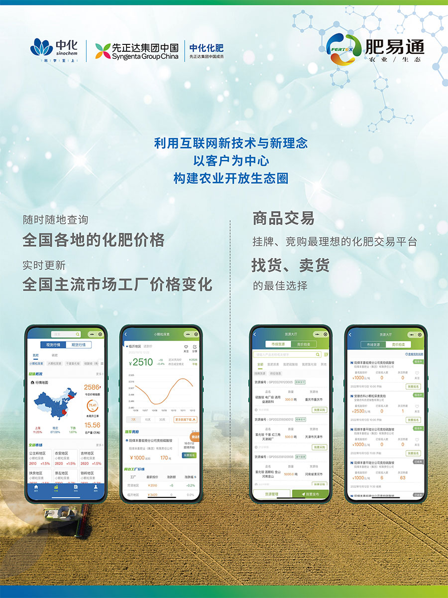 中化化肥通過構建行業產業生態圈,致力于打造集合資訊、物流、交易、供應鏈金融等開放式的行業生態服務平臺“肥易通”,為產業鏈上下游相關利益方多維度服務賦能。