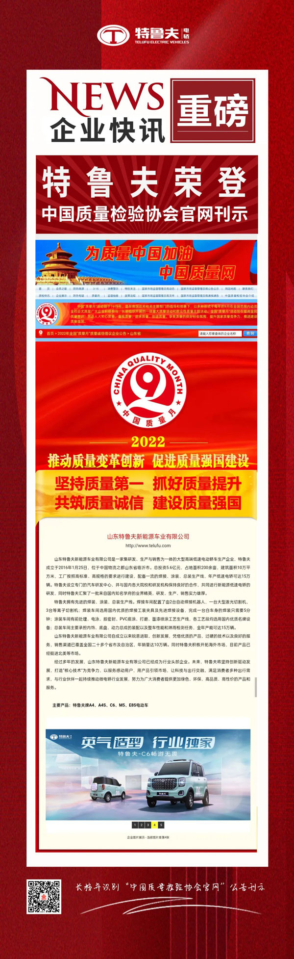 在經過企業申報、質量誠信調查、社會評價、專家評審等多個環節層層考核后,特魯夫順利通過此批次多項證書認證審核,“榮獲全國新能源電轎行業質量領先品牌”、“全國新能源電轎行業質量領先企業”、“全國質量檢驗誠信企業”、“全國產品和服務質量誠信品牌”、“全國質量檢驗穩定合格產品”五大榮譽證書。