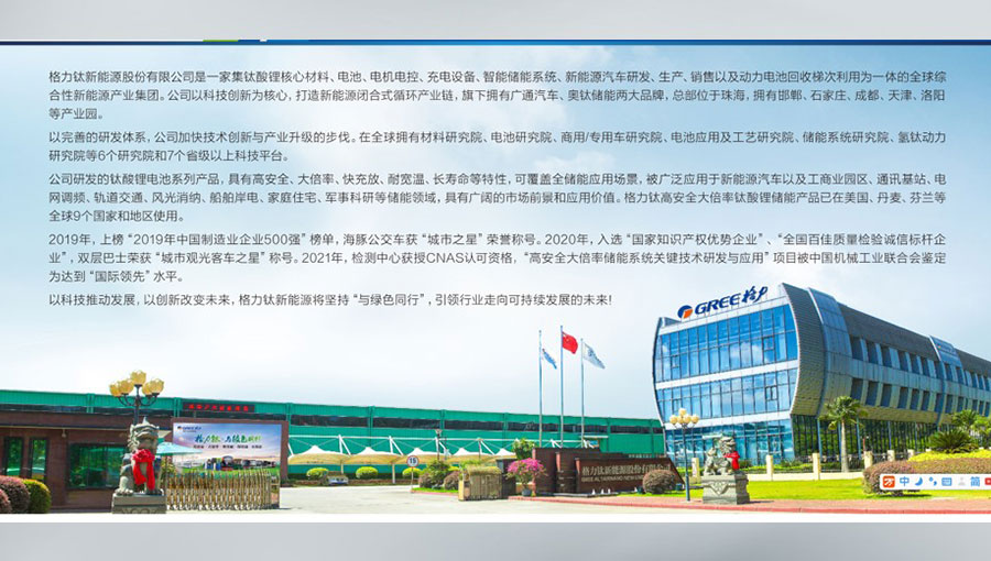格力鈦新能源股份有限公司是一家集鈦酸鋰核心材料、電池、電機電控、充電設備、智能儲能系統、新能源汽車研發、生產、銷售以及動力電池回收梯次利用為一體的全球綜合性新能源產業集團。格力鈦新能源以科技創新為核心,打造新能源閉合式循環產業鏈,旗下擁有廣通汽車、奧鈦儲能兩大品牌,總部位于珠海,擁有邯鄲、石家莊、成都、天津、洛陽等產業園。