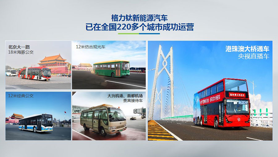 目前,格力鈦生產的新能源汽車于北京、杭州、武漢、青島、哈爾濱、包頭、??诘热珖?20多個城市運營。2014年,仿古鐺鐺車榮膺第22屆北京APEC會議官方指定用車、登陸北京環天安門旅游觀光線。2016年,雙層巴士榮膺第二屆中美低碳峰會指定用車、登陸國內首條純電動雙層觀光車線路——北京城市旅游觀光3線。2017年,18米海豚公交車投入北京長安街1路運營。2018年,港珠澳大橋正式通車,雙層巴士擔綱中央廣播電視總臺直播車,成為首輛駛上港珠澳大橋的大巴車。