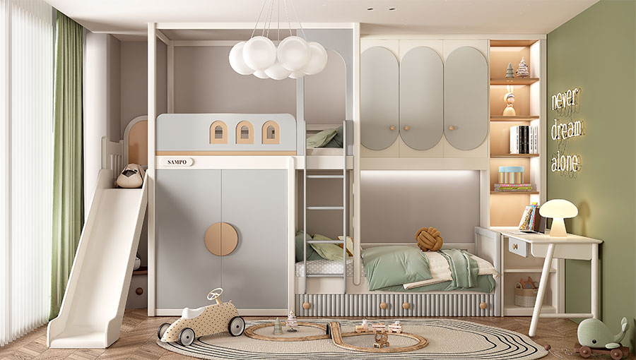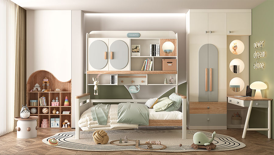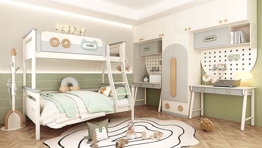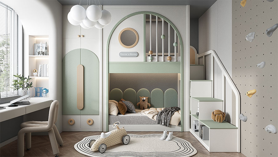 松堡王國圍繞孩子成長居家生活四大基礎功能:學習區、收納區、娛樂區、睡眠區,深度交合孩子成長方式,以美學設計、親子陪伴、趣味模塊為新空間設計概念,正向引導孩子建立良好生活習慣,形成成長生活秩序感,用愛為孩子打造有趣的成長空間。