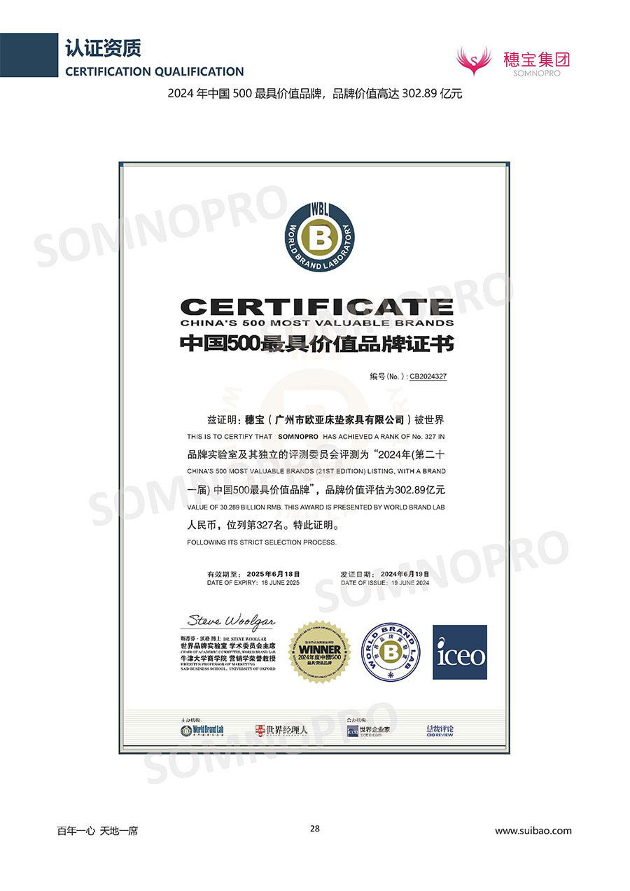 自1971年獨立研發生產出專屬國人的彈簧床墊,穗寶關于優質深度睡眠的研究已有半個世紀的歷史。穗寶一直專注床墊,專注中國消費者的睡眠研究,針對中國人特點進行優化創新,不斷提升國人的睡眠體驗,只為成就每個晚上8小時的優質深度睡眠。憑借不斷革新的研發科技和深受消費者信賴的產品品質,穗寶集團旗下品牌和產品屢獲國內外大獎,連續20年榮膺中國500最具價值品牌,品牌價值高達302.89億元。