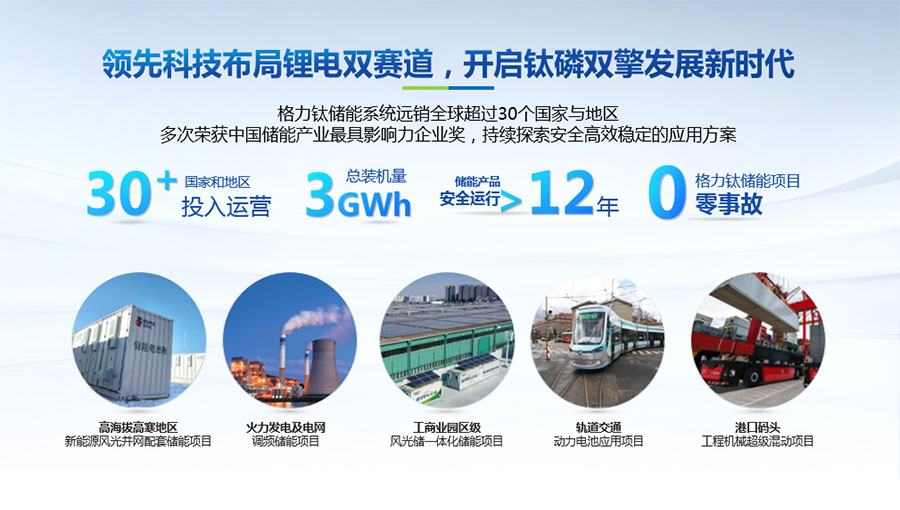 以完善的研發體系,公司加快技術創新與產業升級的步伐。公司研發的格力鈦電池安全性長期領跑行業,憑借具有高安全、大倍率、快充放、耐寬溫、長壽命等特性,被選為“國家制造業單項冠軍產品”,廣泛應用于新能源汽車以及工商業園區、通訊基站、電網調頻、軌道交通、風光消納、船舶岸電、家庭住宅、軍事科研等儲能領域,具有廣闊的市場前景和應用價值。目前,格力鈦儲能產品已在丹麥、瑞士、芬蘭等全球30多個國家和地區使用,新能源汽車產品在北京、杭州、武漢、成都、青島、哈爾濱、包頭、海口等全球240多座城市運營,12年全球零電池事故安全運行。