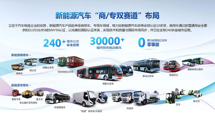 格力鈦新能源股份有限公司一直致力于研發混合動力、氫燃料、純電動車等一系列節能減排的新能源環保型客車/公交車/物流車,所研制產品體現了電子化、智能化、綠色化、節能化的鮮明特色,堅持以產品開發和市場開拓相結合的經營方針,引進國外先進客車生產技術,力爭通過資本、技術及產業優勢,做大區域市場,進軍國際市場,力爭成為中國新能源汽車的領軍企業集團。