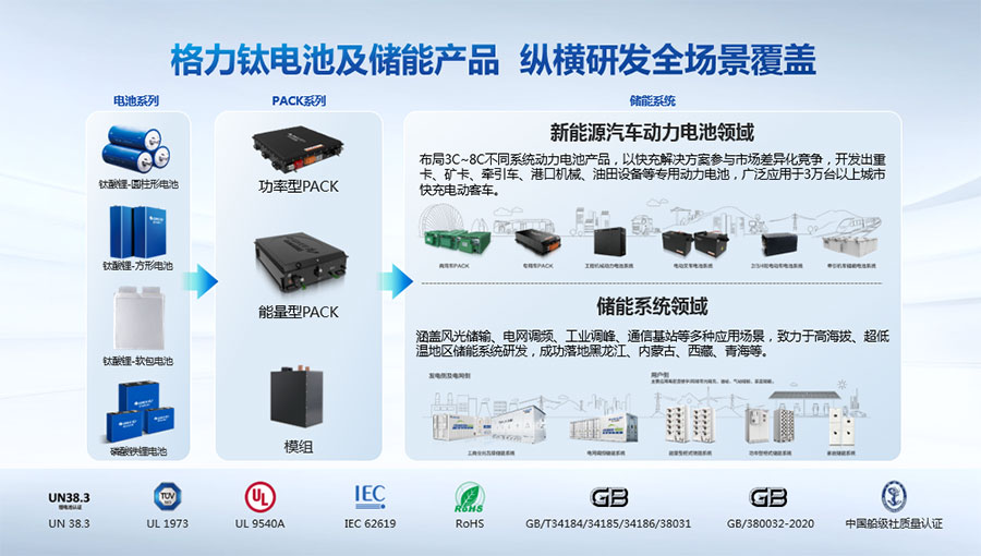 鈦酸鋰電池技術是新能源行業唯一獲得中國專利獎金獎的鋰電池產品技術,其應用于儲能電池和動力電池具有超高安全性,在快充放、耐寬溫、長壽命等方面同樣具有卓越的性能。格力鈦電池系列產品具有不起火不爆炸高安全、6分鐘快充放、-50℃至60℃耐寬溫特性,循環充放電次數高達30000多次,使用壽命長達30年。格力鈦電池經利鋸切割、尖針穿刺、強力擠壓、電鉆沖孔、短路充放電、高溫加熱、槍擊等極限條件測試,均未發生冒煙、起火、燃燒、爆炸等現象。