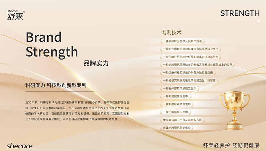 舒萊作為抑菌衛生巾行業標準起草單位,目前累計擁有61項國家專利(含發明專利、實用新型及外觀專利),也在抗菌技術與產業上發表了關于熒光劑增白劑使用的學術研究等,構建了難以復制的技術壁壘。
