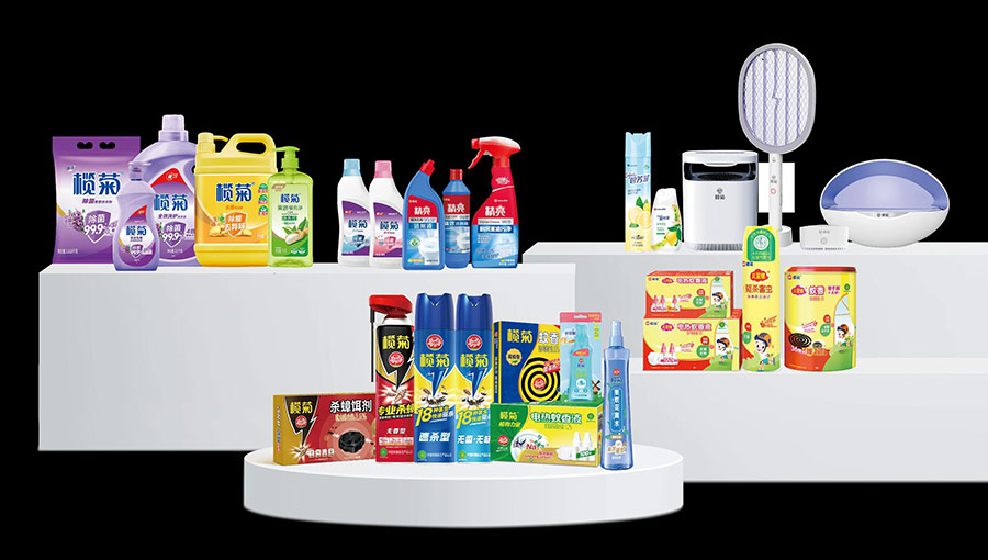 主要產品:欖菊盤式蚊香、電熱蚊香液、驅蚊液、電熱蚊香片、電蚊香加熱器、殺蟲氣霧劑、殺蟑餌劑、滅蚊燈、電蚊拍、洗衣液、洗潔精、洗衣粉、洗衣皂、洗手液、84消毒液、潔廁精(液)、花露水、空氣清新劑等