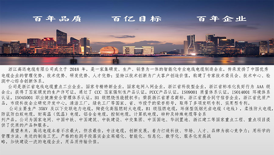 高遠電纜是浙江省電線電纜重點工業企業,浙江省專精特新企業、浙江省科技型企業,浙江省標準化良好行為AAA級企業;獲得了國家頒發的生產許可證,通過了CCC國家強制性產品認證,ISO9001質量體系認證,ISO14001環境體系認證,OHSAS18001職業健康安全管理體系認證,PCCC產品認證、B1級燃燒性能授權書;榮獲浙江省著名商標,浙江省重合同守信譽企業,浙江省優質產品,市級研究開發中心,清潔工廠,綠色工廠等國家、省、市授權的榮譽稱號,取得了多項發明專利、實用型專利。