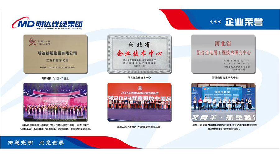 明達線纜先后被評為中國線纜企業百強、礦用橡套電纜企業十強、中國最具投標實力電線電纜供應商百強,國家高新技術企業、國家級專精特新小巨人企業、國家守合同重信用企業、全國質量誠信示范企業、點贊2023我喜愛的中國品牌、全國用戶滿意星級產品、河北省民營企業百強、河北省誠信企業、河北省產業集群龍頭企業、河北省企業技術中心、河北省制造業單項冠軍(鋁合金電纜)、河北省企業標準領跑者、河北省級標準化良好行為試點企業、河北省安全生產標準化企業、邢臺市政府質量獎、邢臺市智能電網及輸配電裝備產業鏈鏈主企業、邢臺市電線電纜協會會長單位等多項資質榮譽。