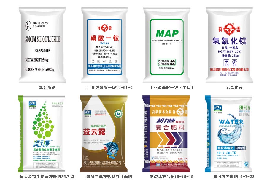 主要產品:祥雲、紅獅犸、紅蕾、火炬牌磷酸一銨、磷酸二銨、復肥、水溶性肥料、氟硅酸鈉、工業磷酸二氫銨、磷酸二氫鉀、工業氫氧化鎂、間苯二酚、過磷酸鈣
