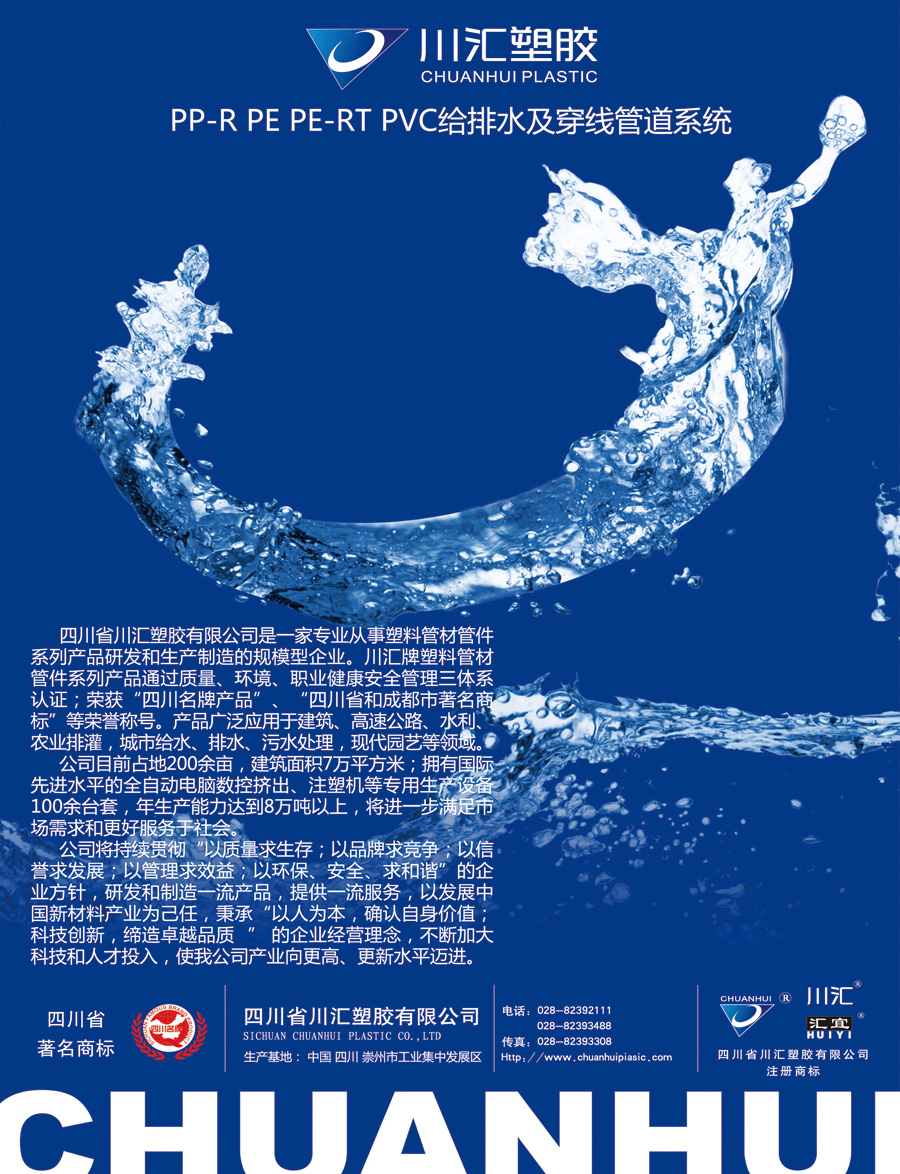 四川省川匯塑膠有限公司是一家專業從事塑料管材管件(PVC給排水管材、管件;電氣安裝用阻燃PVC塑料平導管(電工套管及配件);冷熱水用聚丙烯(PP-R)管材、管件;給水用聚乙烯(PE)管材、管件;燃氣用埋地聚乙烯(PE)管材、管件;高密度聚乙烯(HDPE)雙壁纏繞管材、管件;埋地排水用鋼帶增強聚乙烯(PE)螺旋波紋管;聚乙烯(PE)雙壁波紋管材;冷熱水用PE-RT耐熱聚乙烯地暖管材、管件;C-PVC地埋式高壓電力電纜保護管;川匯牌“匯騰”家裝精品等)、塑膠型材、塑鋼門窗、金屬管道、金屬管道的接頭及配件、球墨鑄鐵管及管件系列產品研發和生產制造的規模型企業。其產品廣泛應用于建筑、高速公路、水利、農業排灌,城市給水、排水、污水處理,現代園藝等領域。