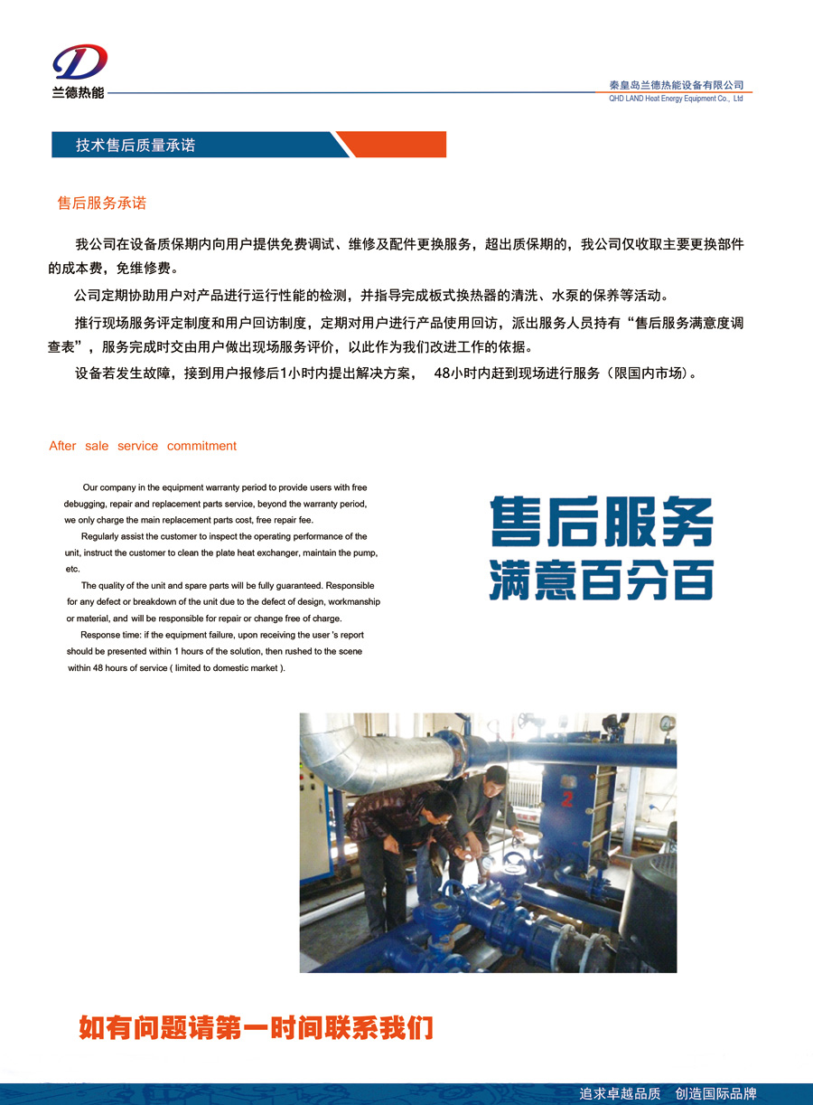 公司秉承“追求卓越品質,創(chuàng)造國際品牌”的經(jīng)營理念,隨時為客戶提供全球領先的換熱解決方案,專業(yè)提供高品質的換熱設備和快速、高效的服務,并贏得了行業(yè)領域多家客戶的信賴。許多國家重點工程項目及全國各大熱力公司都使用了我公司的產(chǎn)品,如大同熱力公司、包頭熱力公司、蘭州熱力公司、西山煤電熱力公司、釣魚臺國賓館、北京國資委、國家大劇院、大眾汽車、長慶油田等。蘭德熱能將竭誠為您提供優(yōu)質的產(chǎn)品和最好的服務!
