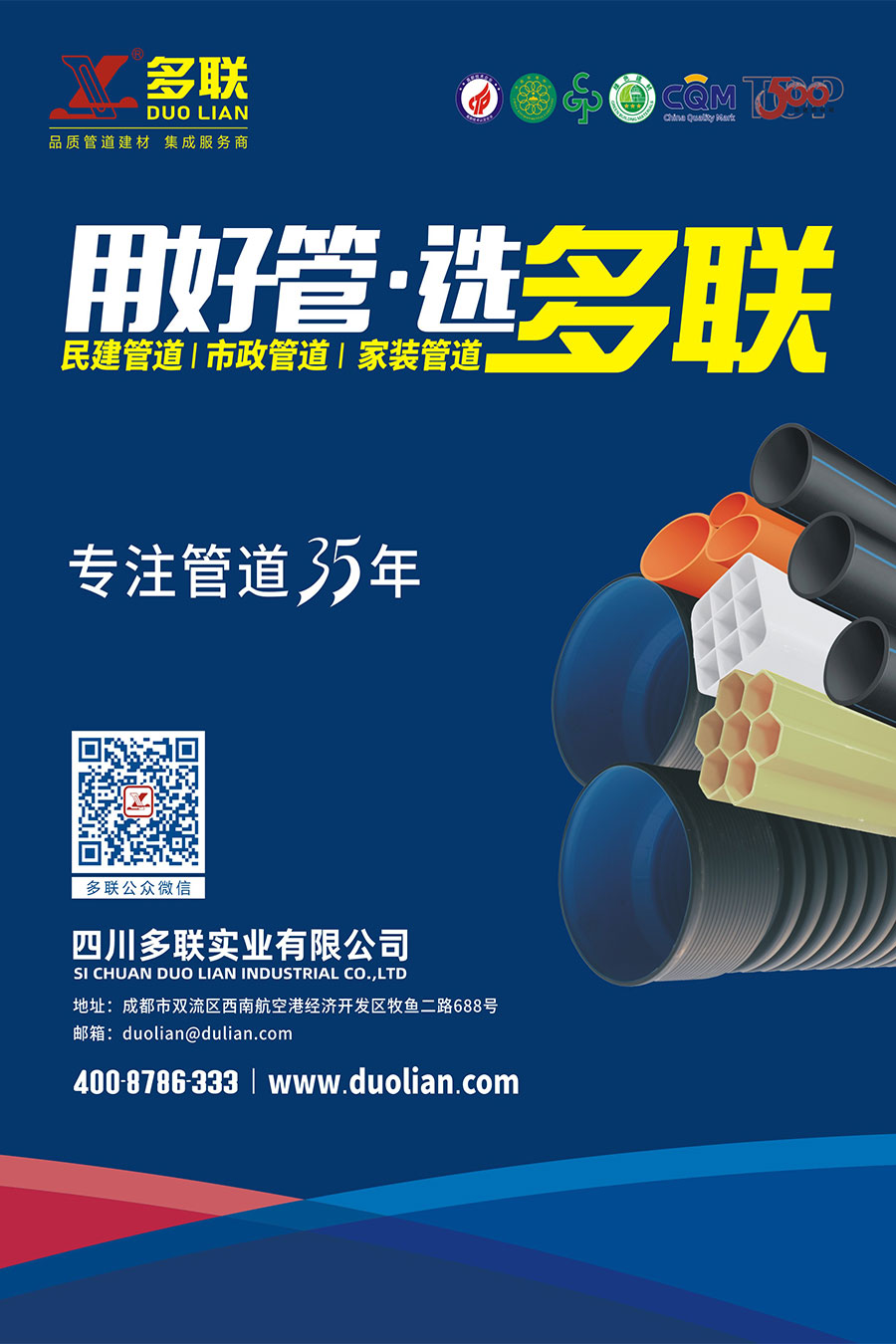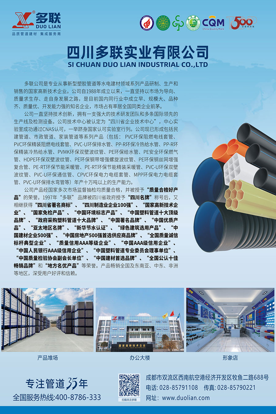 多聯公司以質量為本,堅持走高質量發展和品牌興業之路,企業不斷發展壯大。多聯公司擁有穩定的質量管理體系,通過了ISO9001:2015質量管理體系、ISO14001:2015環境管理體系和ISO45001:2018職業健康安全管理體系認證,多聯公司每種產品均嚴格按照標準生產,每批產品均認真按質量標準檢測,依靠過硬的產品品質和“科學管理,質量第一,高效創新,顧客滿意”的經營理念,本著對社會負責,對用戶負責的態度,向市場提供優質的產品,得到了社會的廣泛認同。多聯公司產品經國家多次市場監督抽檢均質量合格,并被授予“質量合格好產品”的榮譽。1997年“多聯”品牌被四川省政府授予“四川名牌”稱號后,又相繼獲得“四川省著名商標”、“四川制造業企業100強”、“國家高新技術企業”、“國家免檢產品”、“中國環境標志產品”、“中國塑料管道十大頂級品牌”、“政府采購塑料管道十大品牌”、“中國著名品牌”、“中國優質產品”、“亞太地區名牌”、“新華節水認證”、“綠色建材認證產品”、“綠色建筑選用產品”、“中國建材企業500強”、“全國質量誠信標桿典型企業”、“質量信用AAA等級企業”、“中國AAA級信用企業”、“中國人民銀行AAA級信用企業”、“中國塑料管道專業委員會理事單位”、“中國質量檢驗協會副會長單位”、“中國建材首選品牌”、“全國公認十佳暢銷品牌”、四川省“專精特新”企業、成都工業精品和“地方名優產品”等榮譽。產品暢銷全國及東南亞、中東、非洲等地區,深受用戶好評和信賴。