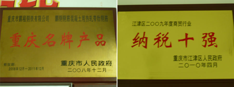 “鵬鋼牌”鋼筋混凝土用熱軋帶肋鋼筋采用了國際上流行的四位一體短流先進生產工藝。2012年公司生產的熱軋帶肋鋼筋HRB400高強鋼筋取得生產許可證,被重慶市政府評為“重慶名牌”產品。“鵬鋼牌”鋼筋混凝土用熱軋帶肋鋼筋每年均受江津區質量技術監督局、重慶市質量技術監督局等部門的監督抽查,合格率達100%。在全市同行中,“鵬鋼牌”鋼筋混凝土用熱軋帶肋鋼筋無論是產量、質量、市場占有率在全市都名列第一。