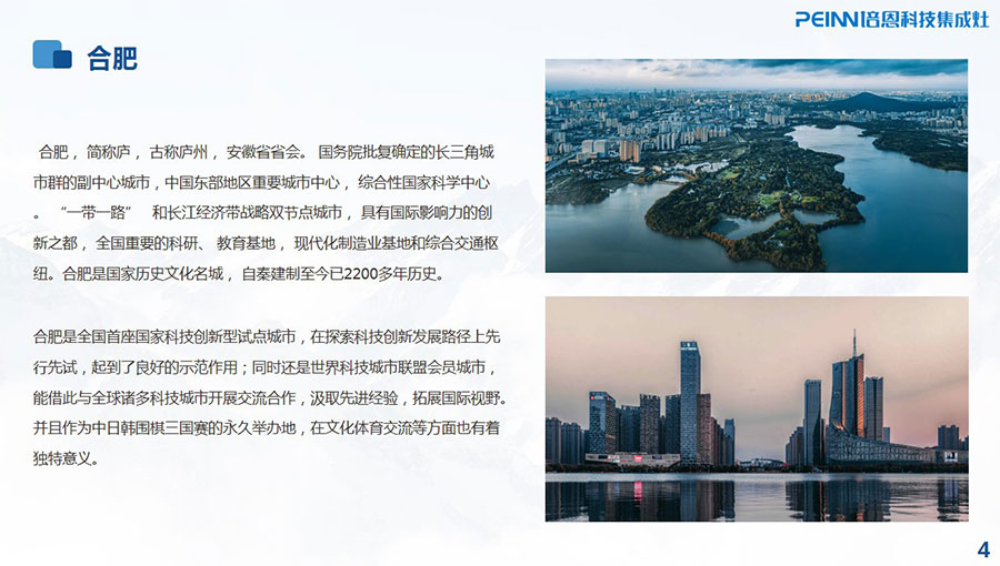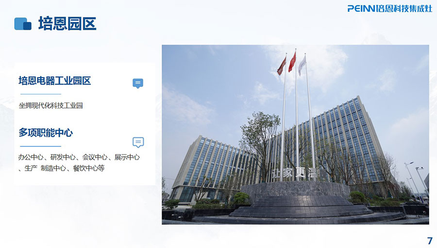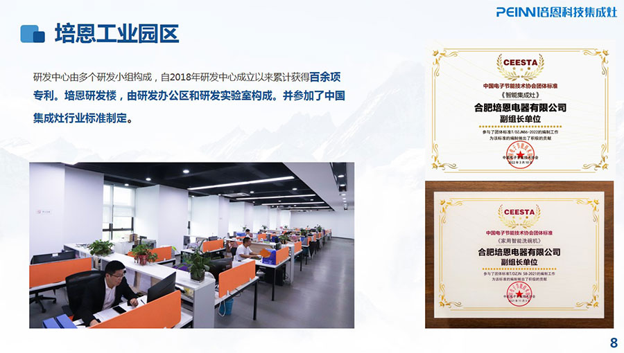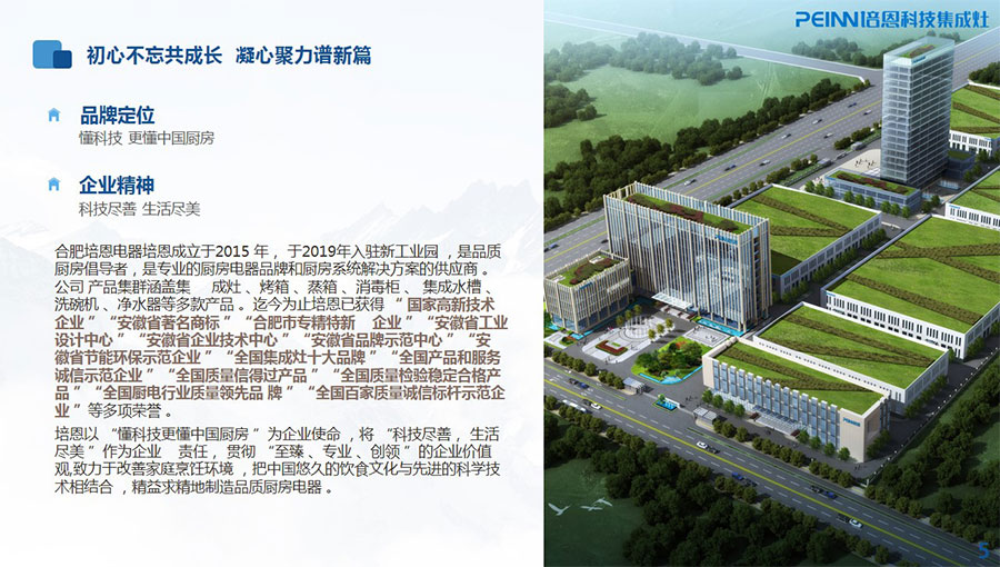 合肥培恩電器有限公司成立于2015年,于2019年入駐新工業園,是品質廚房倡導者,是專業的廚房電器品牌和廚房系統解決方案的供應商。培恩電器產品集群涵蓋集成灶、烤箱、蒸箱、消毒柜、集成水槽、洗碗機、凈水器等多款產品。
