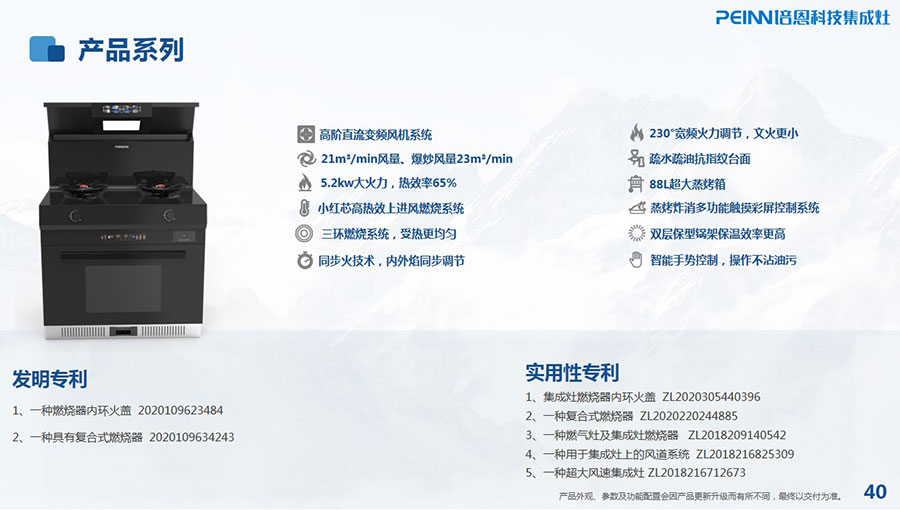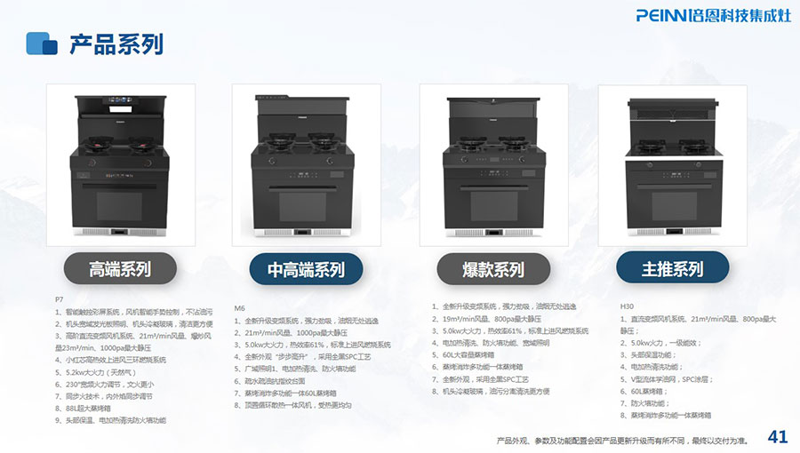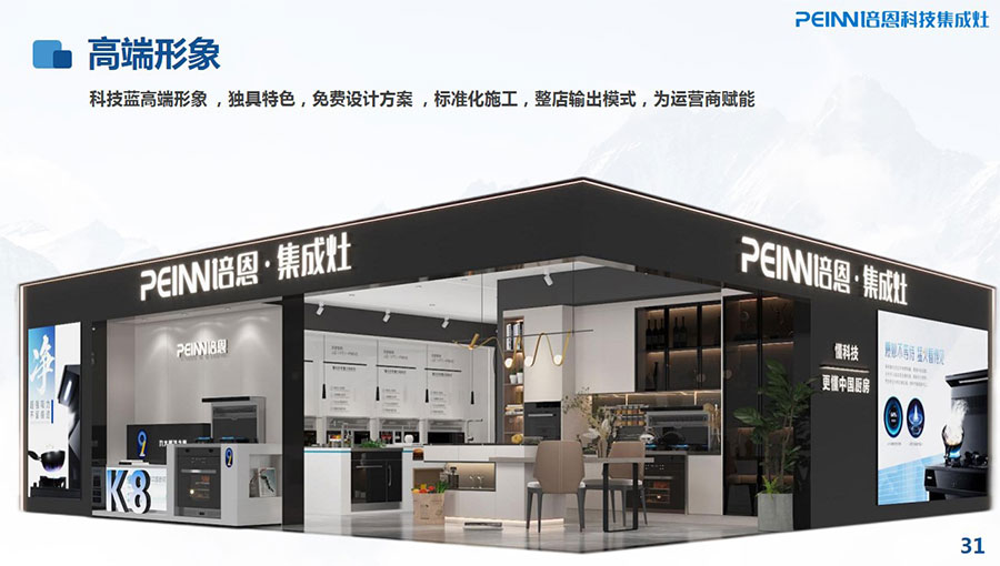主要產品:培恩牌集成灶、煙機、灶具、水槽式洗碗機、消毒柜、櫥柜、凈水器、燃氣熱水器等廚房電器