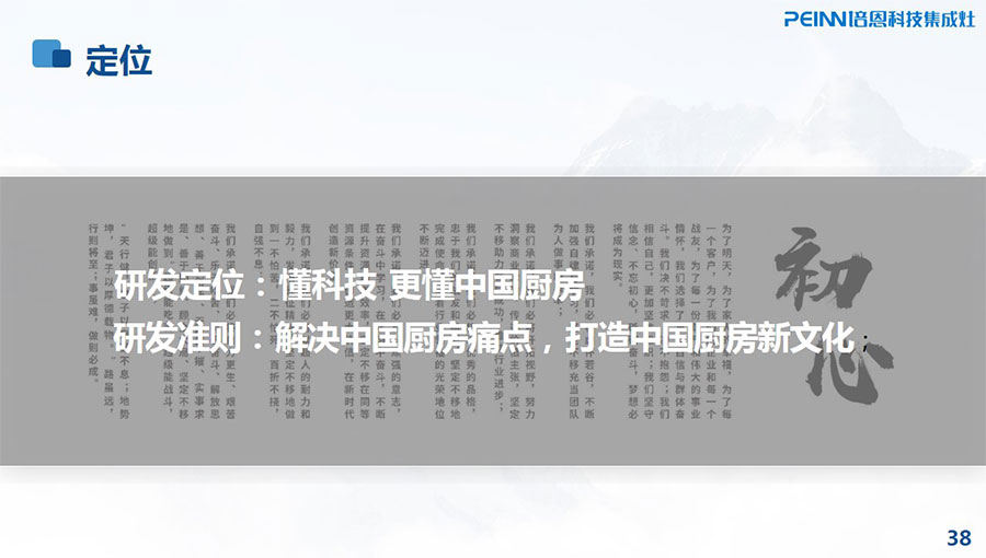 培恩以“懂科技,更懂中國廚房”為企業使命,將“科技盡善,生活盡美”作為企業責任,貫徹“至臻、專業、創領”的企業價值觀,致力于改善家庭烹飪環境,把中國悠久的飲食文化與先進的科學技術相結合,精益求精地制造品質廚房電器。