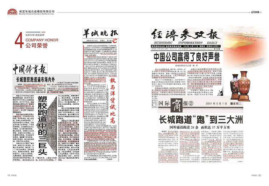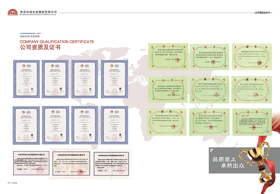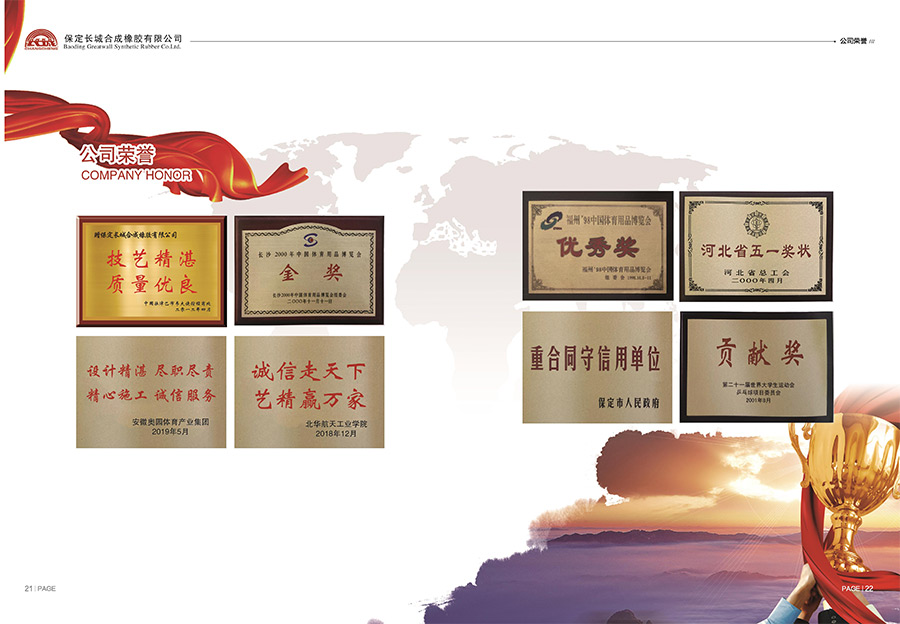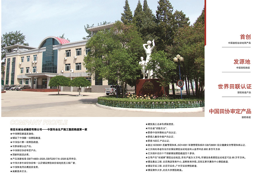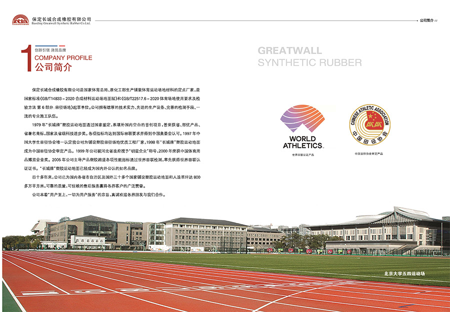 保定長城合成橡膠有限公司是專業(yè)從事研發(fā)、生產(chǎn)、銷售、施工聚氨酯塑膠跑道、球場、健身地坪運動材料的為一體的高新技術(shù)生產(chǎn)企業(yè),該公司原為國家體委、原化工部生產(chǎn)鋪裝體育運動場地材料的定點廠家,是國家標(biāo)準《GB/T14833—2020 合成材料運動場地面層》和國家標(biāo)準《GB/T22517.6—2020 體育場地使用要求及檢驗方法 第6部分:田徑場地》起草單位。1979年國產(chǎn)塑膠跑道由保定長城合成橡膠有限公司研發(fā)成功并投入使用,是國內(nèi)同行業(yè)唯一榮獲國家科技進步三等獎的單位。