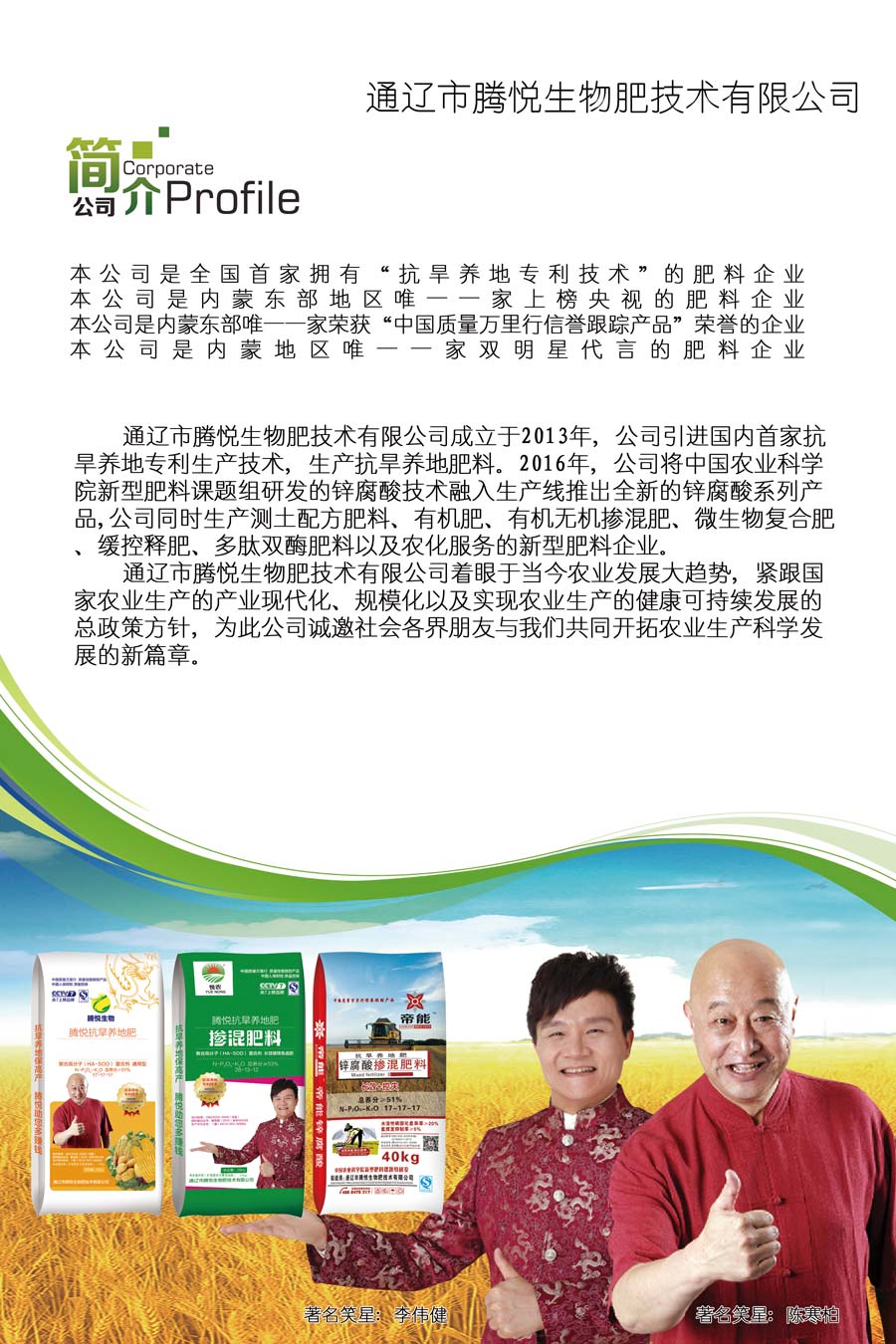 通遼市騰悅生物肥技術有限公司成立于2013年,引進國內首家抗旱養地專利生產技術,生產抗旱養地肥料。2016年,公司將中國農業科學院新型肥料課題組研發的鋅腐酸技術融入生產線推出全新的鋅腐酸系列產品。公司是同時生產測土配方肥料、有機肥、有機無機摻混肥、微生物復合肥、緩控釋肥、多肽雙酶肥料以及農化服務的新型肥料企業。