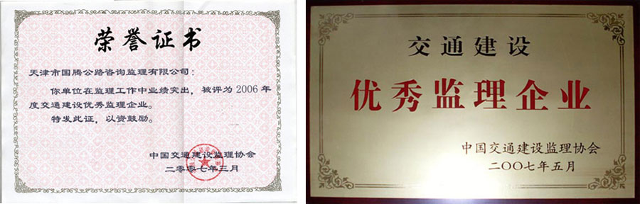 自1998年起,先后有津榆公路蘆臺大橋、東方紅路跨京福高速公路立交橋、北華路、朝陽道、邦喜、津漢、薊官、潘青、津薊高速公路、寶平公路大修、躍進路、大陳路等37項大修改建監理工程被評為天津市政公路工程質量金獎;公司承擔的江西贛定高速公路、陜西延塞高速公路、黃陵高速公路、浙江龍游高速公路、內蒙古哈磴高速公路、京滬高速公路等外埠監理項目多次受到業主和當地政府的嘉獎。目前,京津高速公路、津汕高速公路、國道112線、京津高速延長線、海濱高速公路、內蒙呼市繞城高速公路、江西萍洪高速公路、山西晉候高速公路機電工程和市內27項獨立項目均為在監工程。
