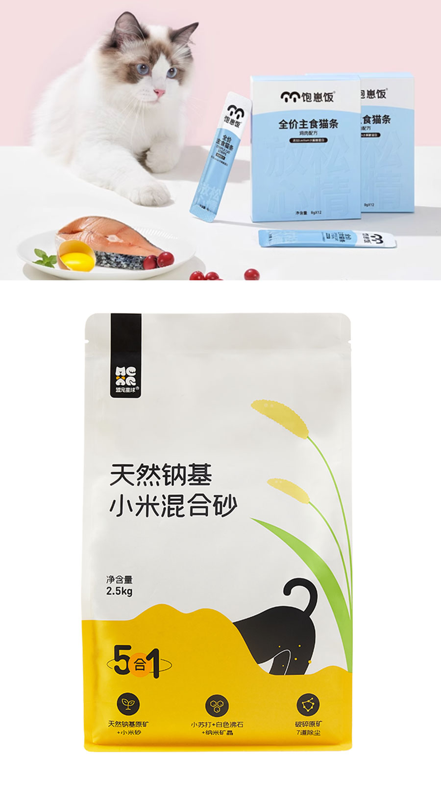 旗下經營盟寵星球寵物用品、飽崽飯寵物食品雙產品線。目前已研發上架十余款產品,主要包括飽崽飯鮮糧碗、全價主食貓條、掰掰杯、羊奶包、主食凍干、天然鈉基礦砂、小米混合貓砂。后期將陸續推出寵物主糧、罐頭、魚油等產品,豐富寵物全鏈路產品線。通過高性價比的優質產品,滿足寵物主日常需求,帶給寵物舒適體驗。