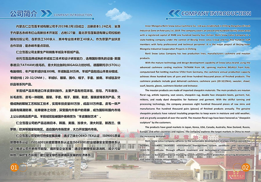 內蒙古仁立雪蓮羊絨有限公司于2019年2月1日成立,注冊資本1.24億元,坐落于內蒙古赤峰市紅山高新技術開發區,占地127畝,是北京雪蓮集團有限公司控股的國有控股公司。在職員工500余人,其中專業技術人員40余人。作為京蒙產業扶貧合作項目,該項目是赤峰市重點項目。