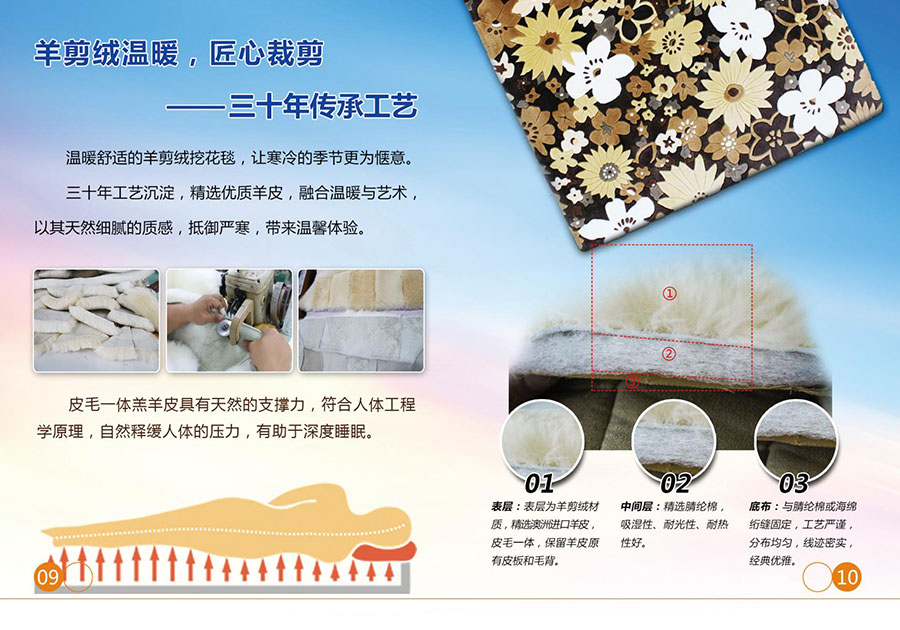 羊剪絨產品采用進口羊皮原料制作。主要產品有挖花床毯、掛毯、汽車座墊、長毛皮形、皮毛一體鞋靴、服裝、手套、帽子、鞋皮、服裝皮等系列產品。憑借成熟的鞣制工藝和加工技術,實現年投皮量80萬張,成品50萬件套。皮毛一體產品具有隔潮防寒、祛寒健體之功效,深受國內外客戶的青睞,成為國際和國內市場上公認的高品質產品。羊剪絨花毯被國外客商譽為“羊皮雕刻藝術”,產品遠銷日本、韓國、美國、加拿大、澳大利亞、新西蘭、俄羅斯、歐洲等國家和地區。適應國內市場需求,大力開發國內市場。
