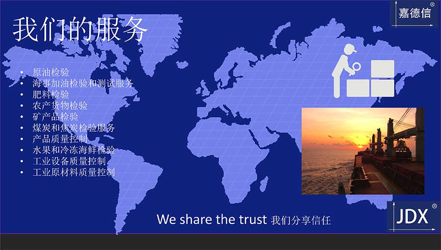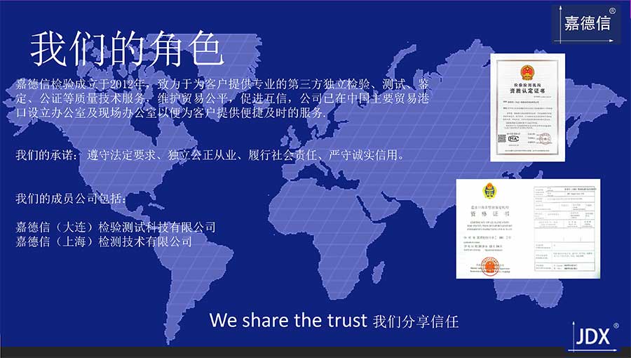 嘉德信(大連)檢驗(yàn)測(cè)試科技有限公司成立于2012年,致力于為客戶提供專業(yè)的第三方獨(dú)立檢驗(yàn)、測(cè)試、鑒定、公證質(zhì)量技術(shù)服務(wù),維護(hù)貿(mào)易公平,促進(jìn)互信,嘉德信已在中國(guó)主要貿(mào)易港口設(shè)立辦公室及現(xiàn)場(chǎng)辦公室以便為客戶提供便捷及時(shí)的服務(wù)。