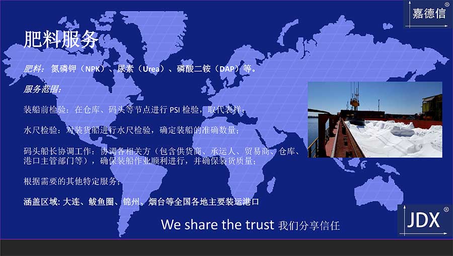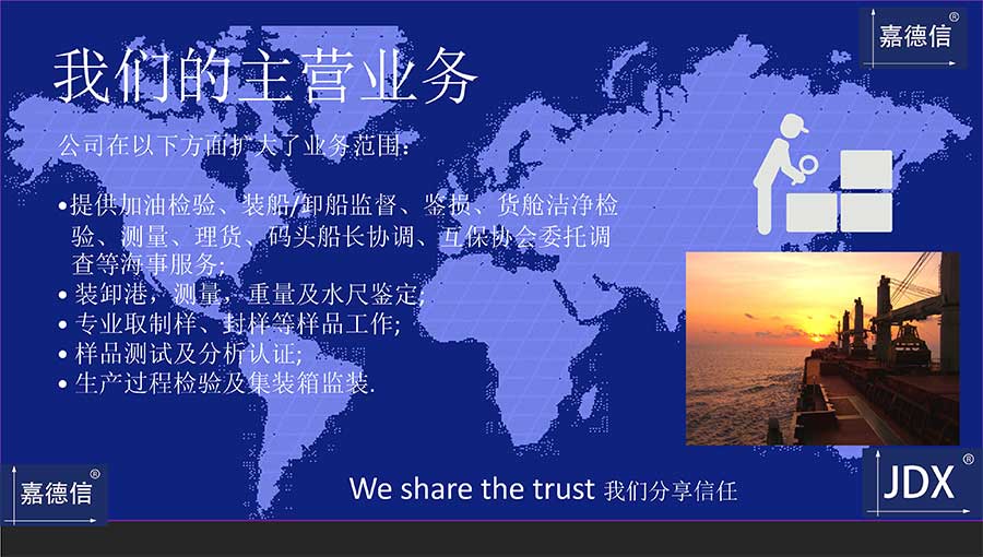 提供加油檢驗(yàn)、裝船/卸船監(jiān)督、鑒損、貨艙潔凈檢驗(yàn)、測(cè)量、理貨、碼頭船長(zhǎng)協(xié)調(diào)、互保協(xié)會(huì)委托調(diào)查等海事服務(wù);