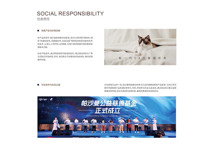 在產(chǎn)品研發(fā)中,帕沙曼選擇無醛添加板材、低VOC涂料等環(huán)保材料,擁有“抗菌科技布、抗菌貓抓布、科技云皮”等新型親膚舒適面料的專利技術(shù),從源頭上守護(hù)家人的健康,為用戶提供健康環(huán)保的整體家居解決方案。