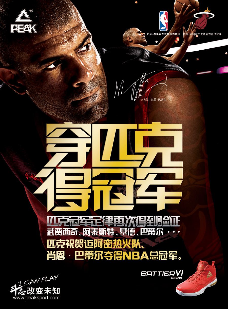 品牌國際化:2005年,匹克全面加速“品牌國際化”戰(zhàn)略,先后通過贊助歐洲籃球全明星賽、斯坦科維奇杯洲際籃球賽等國際一流賽事,攜手休斯頓火箭隊、邁阿密熱火隊等頂級NBA球隊,結(jié)盟NBA、FIBA、WTA等頂級國際賽事組織,簽約巴蒂爾、基德等20多位NBA頂級球星以及格沃特索娃等9位網(wǎng)球明星,支持伊拉克、新西蘭等10多個國家隊和國家奧委會,一舉成為中國體育品牌中,國際資源最豐富的國際化運動品牌。