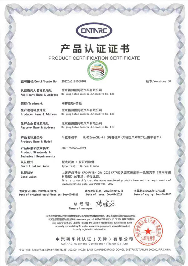 梅賽德斯-奔馳國產重卡Actros 6×4公路牽引車獲“低碳汽車(商用車燃料周期)”認證證書