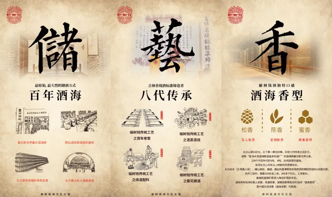 好的品牌需要好的品質作為支撐。長白山源頭好水,天下第一糧倉好糧,歷經八代傳承古法匠藝,234個不同年代的酒海,采用長白山百年以上樹齡的優質黃松木,長白松木(又稱美人松),輔以麻紙、蜂蠟、鹿血和蛋清等有機物質調和糊制而成的168層內膽,純手工制作,需要100多道工序,300多個時日,工序繁雜,基酒經酒海貯藏再入陶壇貯藏多年后,酒體則具有獨特的美人松香、老酒陳香、蜂蜜甜香,是榆樹錢酒業獨特的“酒海香型”。