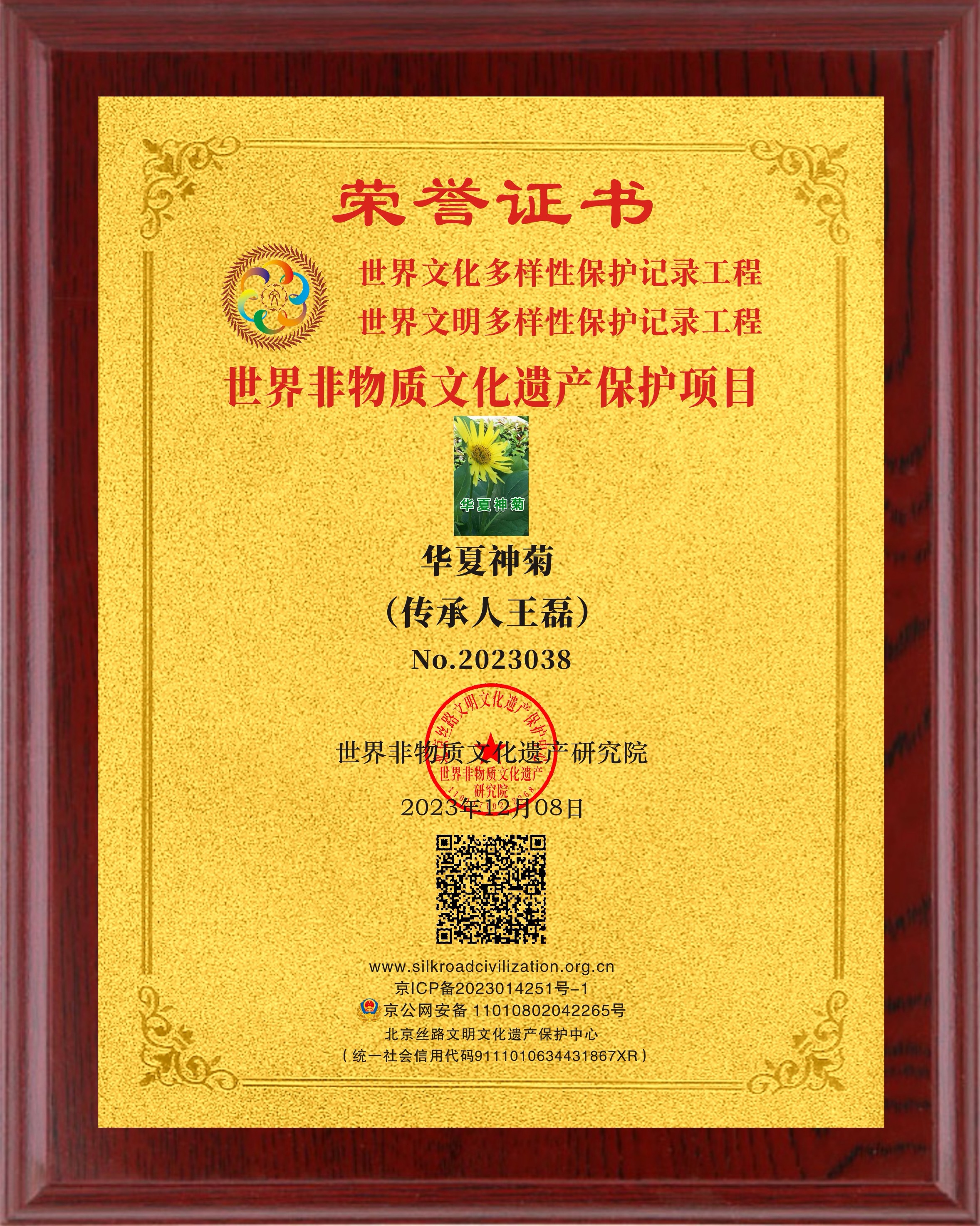 各位“愛菊人”艱難的等待換來了無窮的動力,特別是在2023年12月份獲批“世界非物質文化遺產保護項目”是對“華夏神菊”的種植、加工、研發、和功能、效果等方面的首肯。經歷了近三年的申報於今年12月8日正式申報成功,意味著“華夏神菊”已列入“世界非遺”目錄中,這是國家的榮譽、我們所有“愛菊人”的榮耀,為此,我們華夏神菊產業報國運營團隊將有新的布局:首先,結帳清算,調整種植面積,邀請中科院院士設立:華夏神菊生命科學研究院并設立院士工作站。