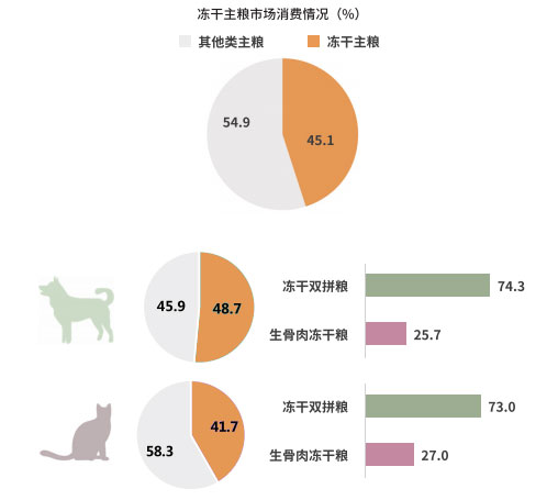 據朗諾與派讀調研數據顯示,目前,寵物凍干類產品在主糧、零食市場的偏好度均持續提升,凍干主糧在犬、貓糧中的滲透率分別為 48.7%、41.7%,凍干零食的滲透率則為 45.4%。其中凍干雙拼糧仍是最受寵物主歡迎的主糧產品,貓凍干主糧及零食市場仍有較大的增長空間與市場潛力。