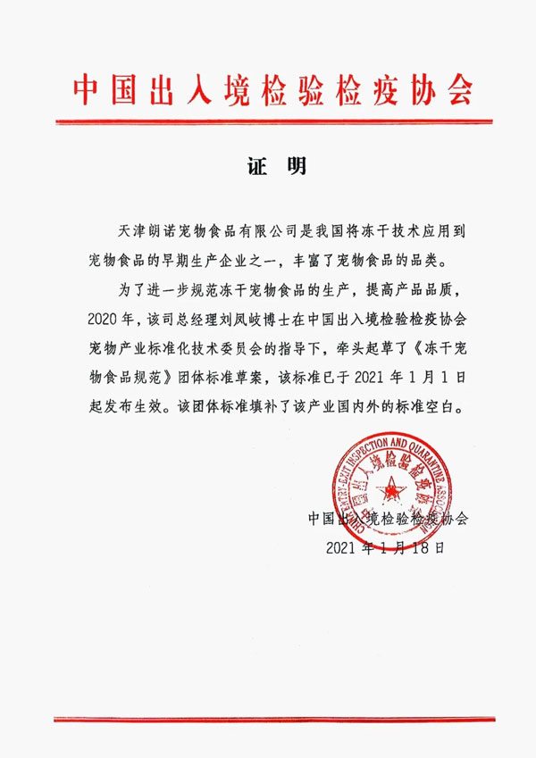 朗諾作為國內率先將國際前沿凍干技術應用于寵物食品研發及生產的企業,始終以推動凍干寵物食品行業規范、引領產業升級為己任。早在2021年1月在寵工委的指導下,由朗諾領銜起草制定《凍干寵物食品規范》正式頒布實施,為中國凍干寵物食品樹立細分行業標準。