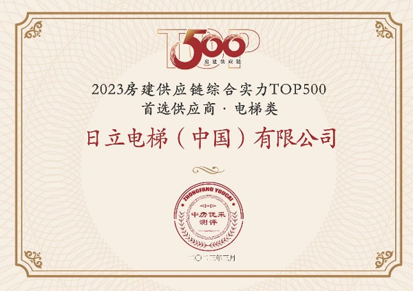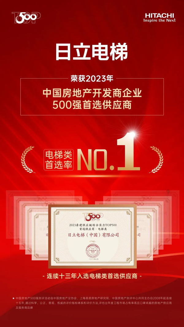 3月23日,2023房地產開發企業綜合實力測評成果正式發布, “2023中國房地產開發企業綜合實力TOP500”“TOP500房企首選供應商”等測評榜單揭曉,日立電梯以電梯品牌首選率18%,再次位居中國房地產Top500首選電梯類供應商榜首。