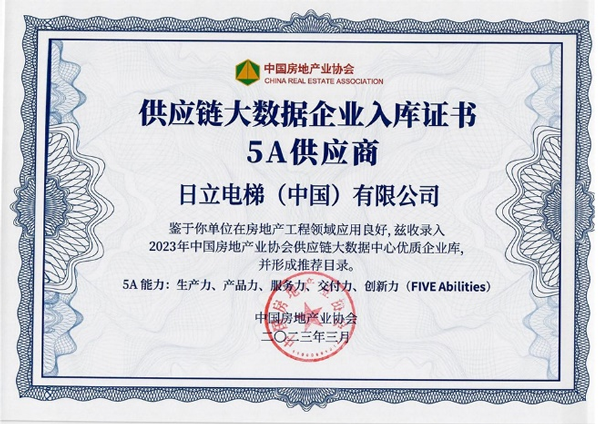 同時,日立電梯憑借在“生產力、產品力、服務力、交付力、創新力”的出色表現,成為中國房地產業協會供應鏈大數據中心“5A供應商” 入庫企業。