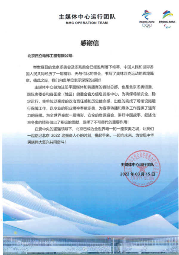 日立電梯還為第24屆北京冬季奧林匹克運動會兩大賽區6大場館、提供了超過200臺電扶梯產品,包括唯一新建冰上競賽場館“冰絲帶”,并且在長達兩個多月的駐點保障期間達成零故障護航目標,贏得冬奧組委的認可。