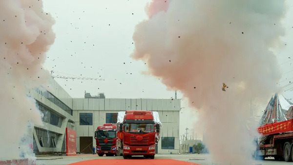 4月6日下午13點38分,隨著兩排禮炮沖天而起,一排滿載電梯的卡車緩緩駛出通用電梯未來工廠的大門,通用電梯向蘇州地鐵8號線交付的首批電/扶梯正式發運。