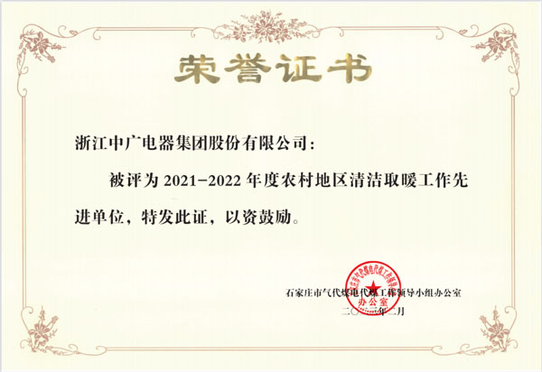 日前,浙江中廣電器集團股份有限公司榮獲由石家莊市氣代煤電代煤工作領(lǐng)導(dǎo)小組辦公室授予的“2021-2022年度農(nóng)村地區(qū)清潔取暖工作先進單位”榮譽稱號,以此表彰以中廣電器集團在當(dāng)?shù)剞r(nóng)村地區(qū)清潔取暖工作中所作出的杰出貢獻。