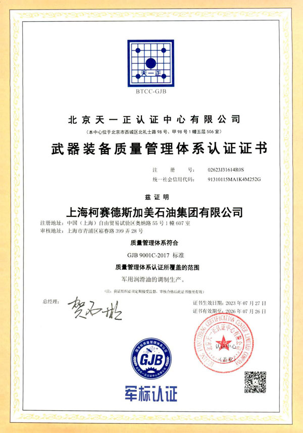 日前,上海柯賽德斯加美石油集團有限公司在質量管理、生產制程和技術創新方面再上新臺階,實現質量管理體系認證的重大突破,取得“武器裝備質量管理體系認證”證書。