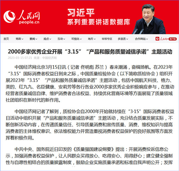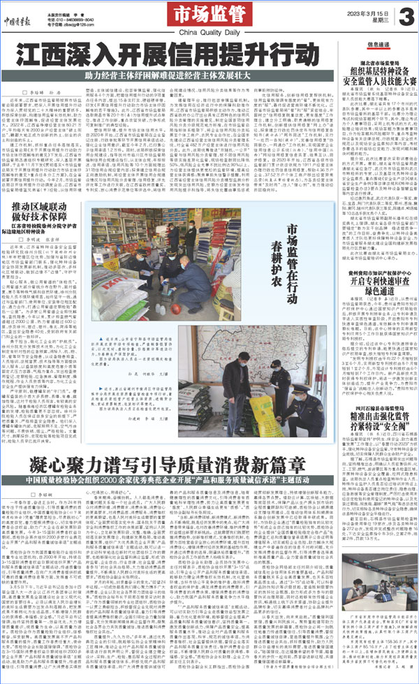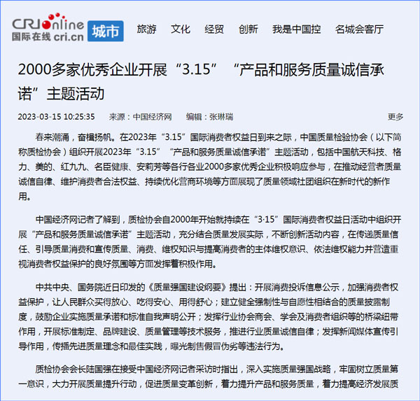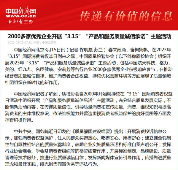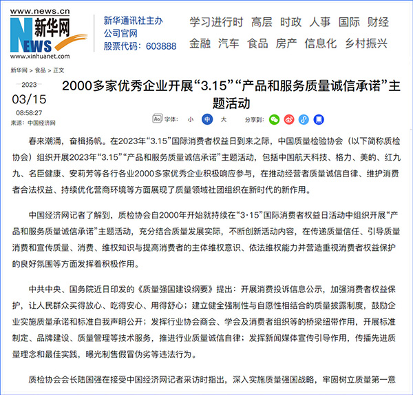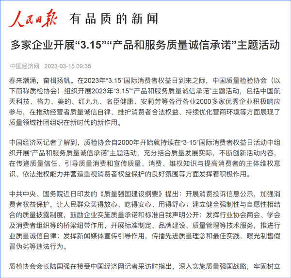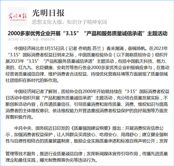中國質(zhì)量報:凝心聚力譜寫引導質(zhì)量消費新篇章——中國質(zhì)檢協(xié)會組織兩千多家企業(yè)開展“產(chǎn)品和服務質(zhì)量誠信承諾”主題活動