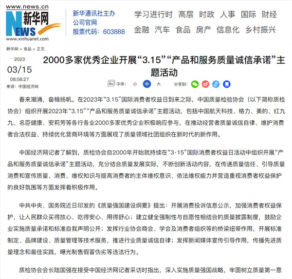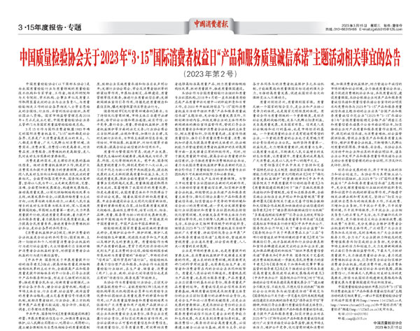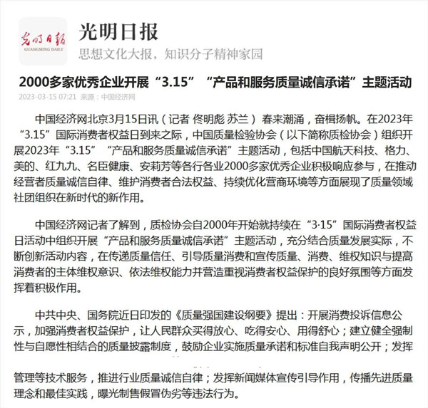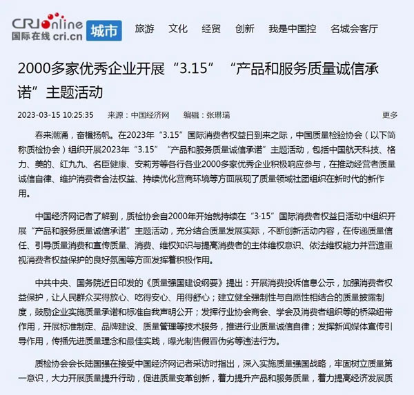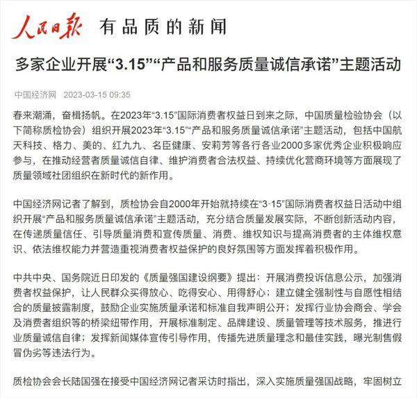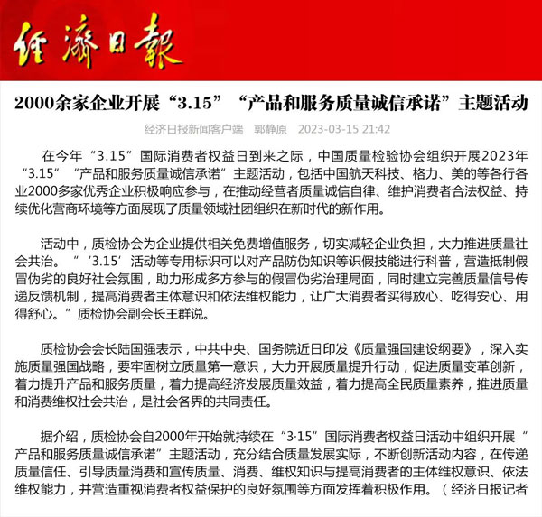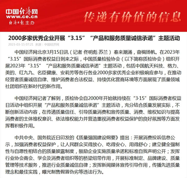 ——中國質(zhì)量檢驗(yàn)協(xié)會(huì)組織2000多家優(yōu)秀典范企業(yè)開展“3.15”產(chǎn)品和服務(wù)質(zhì)量誠信承諾活動(dòng)