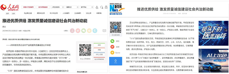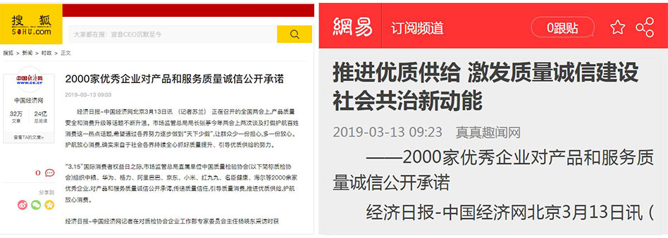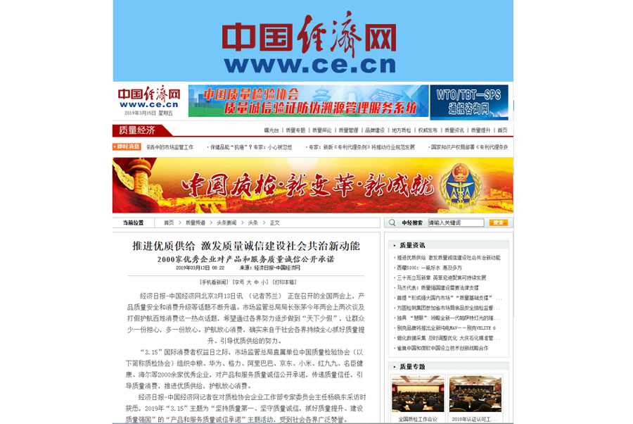 •中國經濟網《推進優質供給 激發質量誠信建設社會共治新動能 2000家優秀企業對產品和服務質量誠信公開承諾》