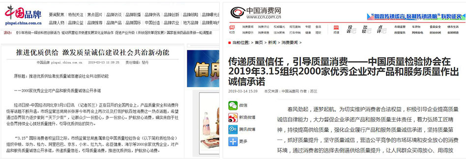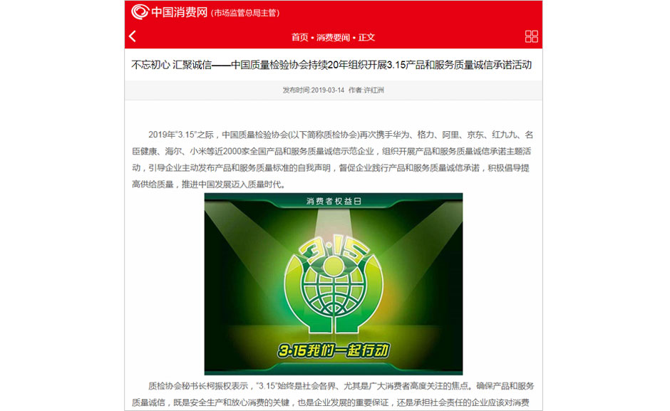•中國消費網《傳遞質量信任,引導質量消費——中國質量檢驗協會在2019年3.15組織2000家優秀企業對產品和服務質量作出誠信承諾》