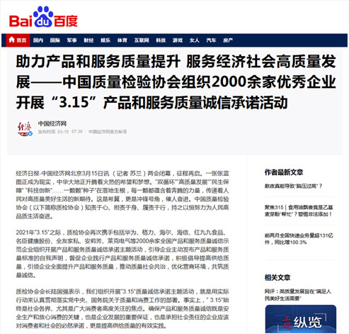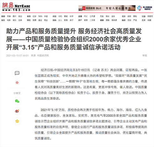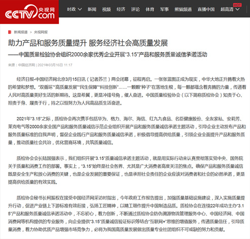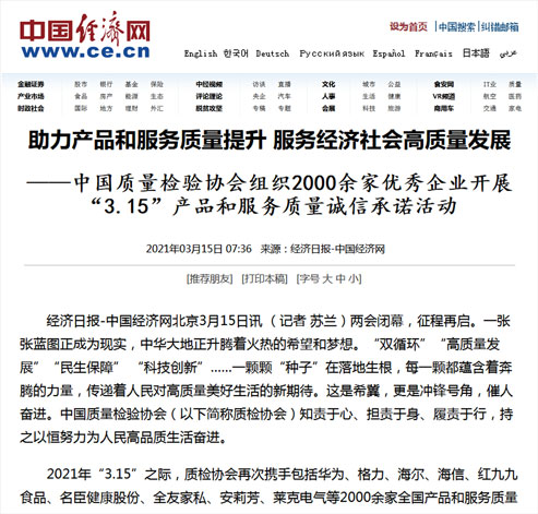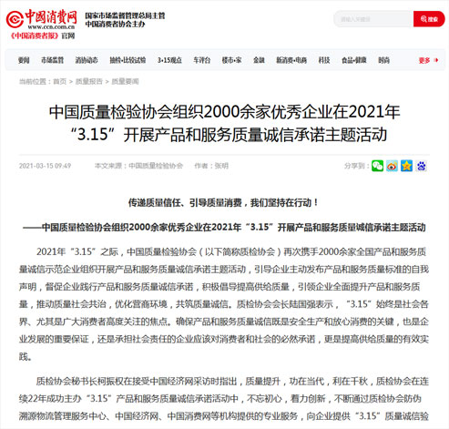 中國經濟網:傳遞質量信任、引導質量消費,我們堅持在行動!——中國質量檢驗協會組織2000余家優秀企業在2021年“3.15”開展產品和服務質量誠信承諾主題活動