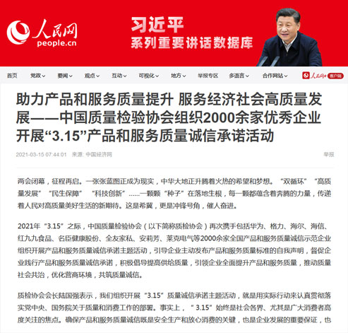 人民網:2000家質量領先企業開展 "3.15"產品和服務質量誠信承諾活動